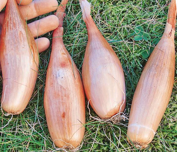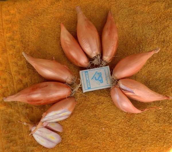 Échalotes Les échalotes sont considérées comme l'un des hybrides les plus productifs. Une plante peut produire jusqu'à 10 bulbes. Cette variété ne produit pratiquement pas de flèches et résiste à la pourriture. Les bulbes ressemblent aux oignons en ce sens qu'ils sont de forme ronde et sont de couleur blanche à l'intérieur et jaune doré à l'extérieur. La boucle d'oreille est déjà récoltée le 58e jour de la saison de croissance. Convient pour la culture dans tous les domaines.