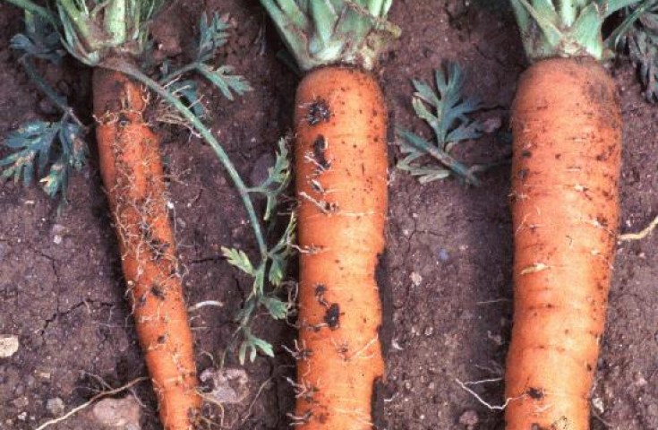 Cette maladie est aussi appelée pourriture sèche. Le champignon infecte les racines mûres à la fin de la saison de croissance, mais les premiers signes de la maladie peuvent être observés sur les tiges. Des taches gris-brun caractéristiques de forme oblongue apparaissent sur les pétioles et les feuilles. Des dépressions brun foncé commencent à se former sur les carottes elles-mêmes. Sur les zones touchées, vous pouvez voir de petits points noirs - ce sont des spores fongiques. Comme la maladie affecte d'abord les fanes, les premières taches apparaissent à la base des carottes.