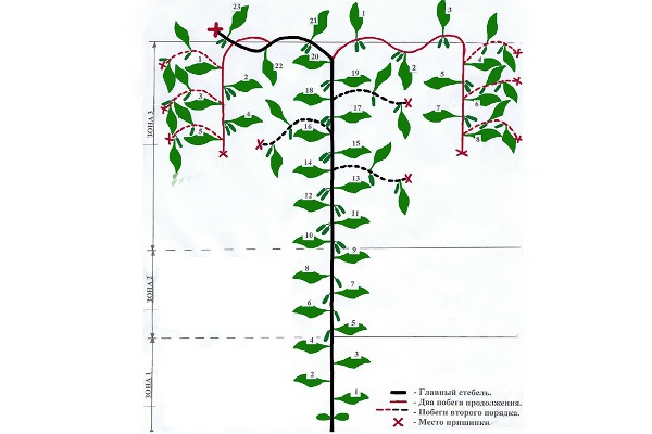 Pour que les pousses ne se cassent pas, poussent uniformément et résistent au poids des fruits, elles sont attachées à des treillis verticaux, fixant le sommet à un fil horizontal.