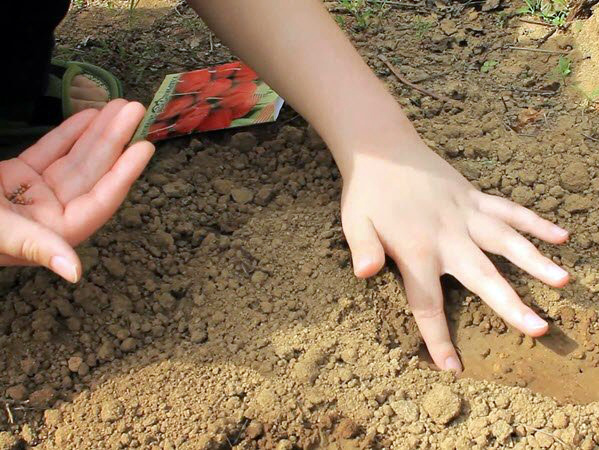 Le semis lui-même est appelé plantation par certains, car les graines sont disposées une à une tous les 5 à 7 cm, puis recouvertes d'une fine couche de terre ne dépassant pas 1,5 ou 2 cm (pour les variétés à longues racines) et légèrement tassé, de manière à obtenir une forte adhérence de la terre à la graine. Vous pouvez, bien sûr, semer, en fin de compte, puis percer les semis. La plupart des résidents d'été font exactement cela. Mais le radis, bien qu'il préfère les sols meubles, nécessite un relâchement constant, néanmoins il n'aime pas être dérangé - et l'éclaircissage des pousses fréquentes inquiète même les germes qui restent à pousser.
