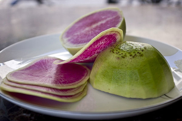Le radis pelé est ajouté aux salades, et l'apparence spécifique, mais en même temps belle, permet au légume d'être une décoration pour les cocktails. Le "dessert" est magnifique sous la forme de morceaux de légumes tranchés saupoudrés de graines de sésame noires.