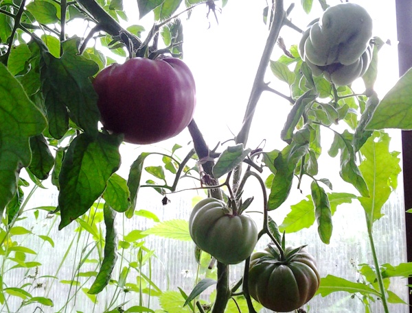 En règle générale, toutes les variétés de tomates à gros fruits sont indéterminées, et le secret de Babushkin ne fait pas exception, et il n'y a rien d'étrange à ce que les plantes poussent jusqu'à 2 m (hauteur moyenne - 150-170 cm). C'est une variété de mi-saison, la maturation se produit en 115-125 jours. Les fruits sont très gros - les tomates secrètes de Babushkin prennent du poids jusqu'à 1 kg, donc par rapport à la plupart des variétés, elles peuvent être qualifiées de très gros fruits. Ils ont une forme ronde et plate, sont peints dans une riche couleur rouge-framboise, alors qu'ils ont un excellent goût (ils ont un goût légèrement sucré). Les graines dans les fruits en contiennent une petite quantité, ce qui dérange légèrement les jardiniers ardents. La pulpe est dense, juteuse, parfaite pour la transformation en produits à base de tomates, mais le plus souvent elle est consommée fraîche et utilisée pour préparer divers plats (principalement des salades). De plus, une excellente option serait d'utiliser les tomates secrètes de grand-mère pour la récolte d'hiver.