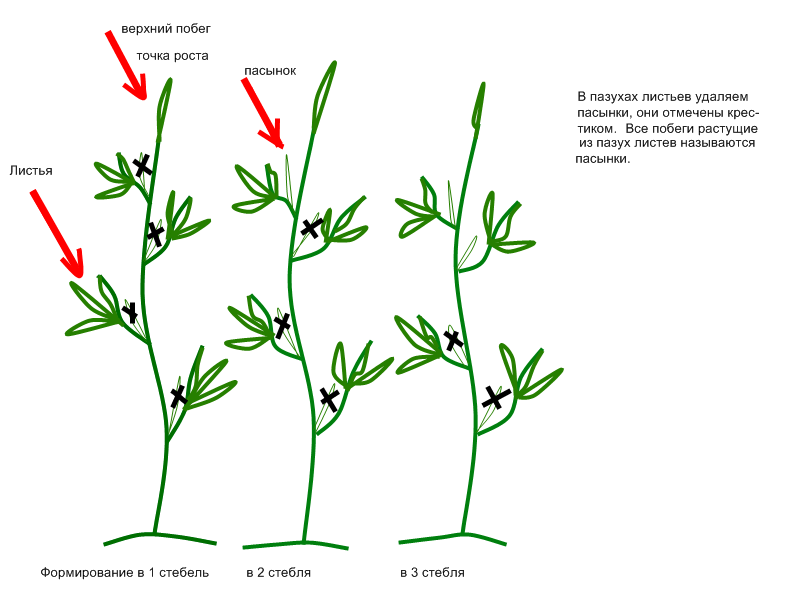 - Pincement régulier une fois par semaine ou une fois tous les 10 jours. Si vous formez un buisson en une tige, vous enregistrez la pousse principale, si deux - ajoutez-y un beau-fils d'une feuille sous la première inflorescence, si trois - ajoutez la suivante.