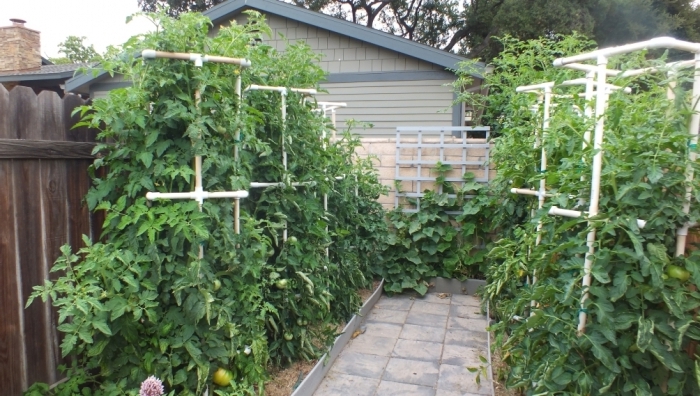 Si le lit est long, alors il faudra renforcer la structure en enfonçant des piquets intermédiaires supplémentaires, alors aucun vent ne sera terrible pour votre jarretière. Et si vous plantez 2 plates-bandes parallèles les unes aux autres à une courte distance, la structure sera utile pour attacher les tomates des deux à la fois: vous obtiendrez une sorte de cabane à tomates.