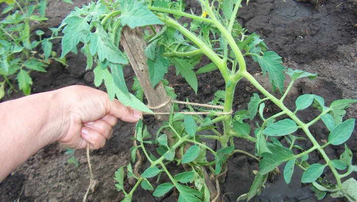 Chacun des piquets doit être renforcé dans le sol afin qu'il soit fermement maintenu, généralement enterré de 20 à 25 cm, en retrait de la tige de la tomate d'environ 10 cm, afin que le système racinaire ne soit pas endommagé par inadvertance. Vous devez attacher la tomate sans serrer, il sera correct de fixer d'abord la ficelle sur la cheville, puis d'enrouler la tige et de l'attacher. Au fur et à mesure que le légume pousse, nous effectuons ce processus plusieurs fois.