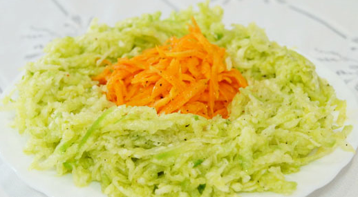 - Broyer un légume-racine, une carotte et une pomme sur une râpe moyenne. Placer dans un bol et ajouter le zeste d'orange ou de citron. Saupoudrer d'herbes. Assaisonner de sel et d'huile de tournesol.