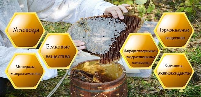De plus, le miel contient de nombreux micro- et macroéléments, notamment du potassium, de l'iode, du phosphore, du zinc, du fluor, du cuivre. Enrichi en vitamines, acides aminés et antioxydants. Cependant, le zeste est donné au produit par les déchets des abeilles : cire, propolis, venin d'abeille, gelée royale, pain d'abeille et perles.