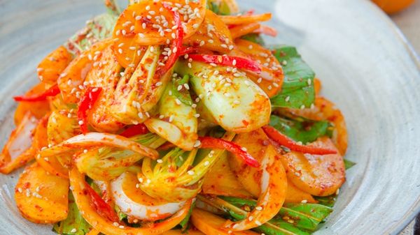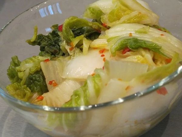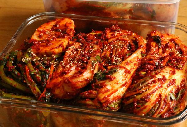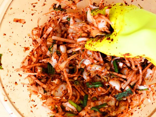 Cette version du kimchi diffère de la classique en ce qu'elle ajoute 2 fois plus de radis daikon, de racine de gingembre (râpé) et d'oignons hachés. Tous ces ingrédients, ainsi que les épices, les oignons verts et l'ail, sont moulus jusqu'à consistance lisse et combinés avec une sauce à la farine de riz. Ensuite, le mélange obtenu est transformé en feuilles de chou de Pékin salé.