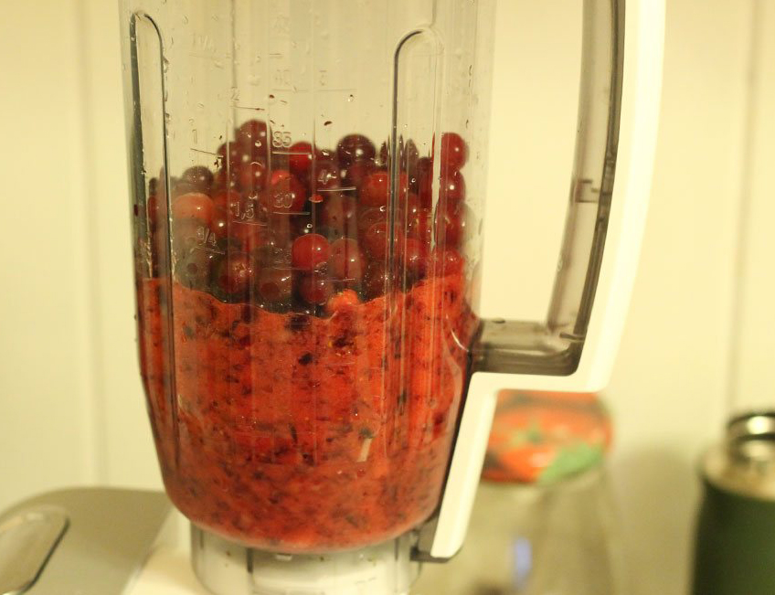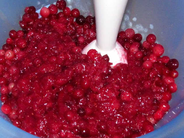 Tout d'abord, la baie doit être retirée du congélateur et laissée décongeler un peu. Les pommes doivent être soigneusement lavées et dénoyautées. Les fruits doivent être coupés en cubes. Les canneberges et les pommes sont combinées dans un récipient et hachées avec un mélangeur jusqu'à consistance de purée. Le sucre est ajouté à la confiture et bien mélangé.