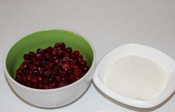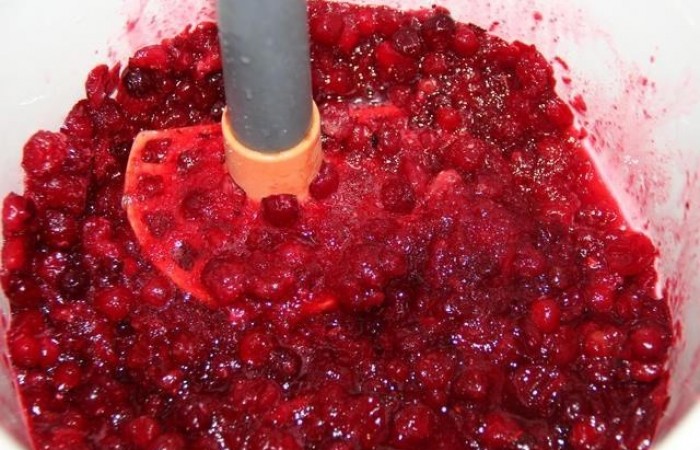 Pour commencer, les fruits sont décongelés, lavés à l'eau courante. Ensuite, les canneberges sont broyées en purée, pour lesquelles elles utilisent un mélangeur ou pétrissent à la main. Hacher les baies à la main permettra d'économiser plus de vitamines et de minéraux.