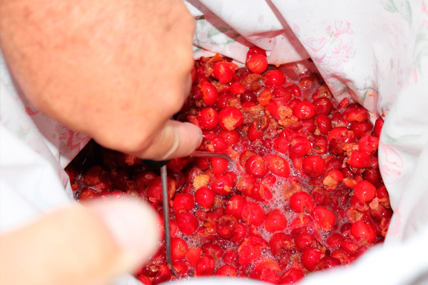 - Les matières premières fermentées sont filtrées à travers une étamine dans un récipient vide, les baies elles-mêmes sont broyées sur un tamis, la pulpe râpée est ajoutée au moût.