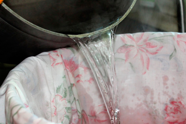 - Après quatre jours, le jus fermenté activement est filtré à travers une étamine ou un tamis.