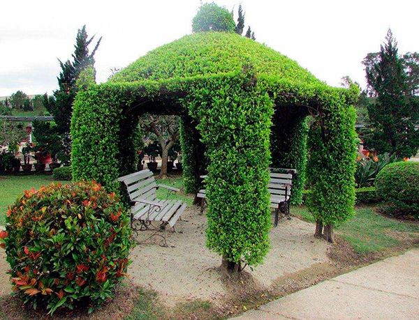 - En forme de dôme. Cette option sera une excellente solution de conception. Un tel belvédère ressemble à une maison de conte de fées, tressée de vignes. Vous pouvez choisir la taille et les dimensions qui vous conviennent, en le rendant miniature ou énorme afin que vous puissiez inviter des invités par une chaude journée d'été. Avantages de conception: les plantes reçoivent suffisamment de lumière du soleil et la structure décorera la zone suburbaine.