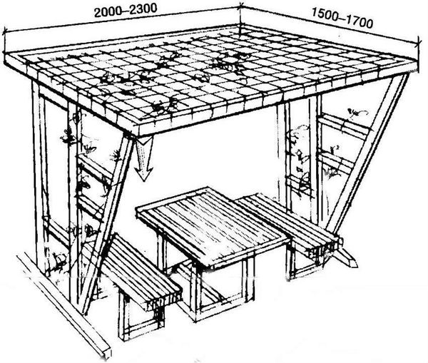 - Forme libre. Si vous ne souhaitez pas utiliser les options déjà familières, vous pouvez connecter votre imagination et construire un belvédère à votre discrétion. Il suffit de créer un cadre solide, de calculer correctement la superficie et de prendre en compte les particularités des raisins qui pousseront sur un tel belvédère.