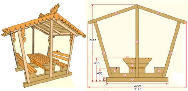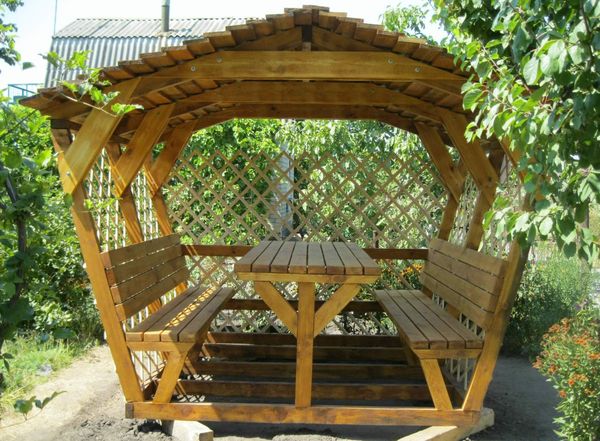 La description suggérée est l'une des centaines d'options. La construction du même belvédère en bois ne coûtera que 4 à 5 000 roubles. Parmi les outils, vous aurez besoin d'un avion, d'un tournevis, d'un paquet de vis autotaraudeuses, d'une scie et d'un niveau de construction. Tout cela est disponible dans presque tous les foyers.