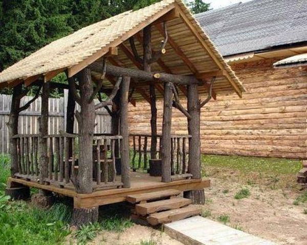 - Construction à partir de troncs d'arbres. Convient uniquement pour les gazebos ouverts. Vous devrez acheter uniquement le matériau pour le toit.
