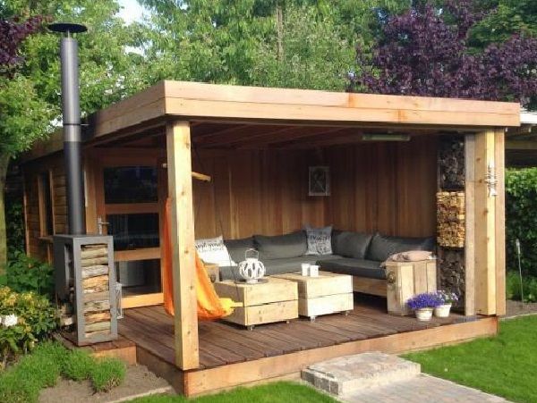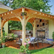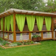 Au stade final - l'embellissement du gazebo: la conception du barbecue, l'installation de meubles et d'éléments décoratifs. Vous pouvez mettre de beaux oreillers lumineux sur des bancs en bois et des bougies parfumées dans des chandeliers exquis sur les tables. Les murs du gazebo peuvent être décorés avec du tulle clair ou des auvents décoratifs spéciaux.