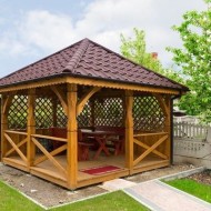 - Le style japonais est devenu très populaire auprès des propriétaires de jardins au cours des dernières décennies. Un trait caractéristique des belvédères de ce style est un toit composé de plusieurs niveaux ou une pagode. Le design est minimaliste et le toit, au contraire, est rendu spectaculaire, avec des coins surélevés pour obtenir l'effet d'une structure flottante et aérée.