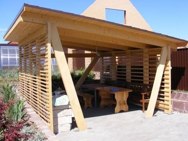 En présence de bois, les matières premières peuvent être fabriquées à la maison. Les lattes inclinées transversalement sont idéales pour décorer des gazebos sans murs vierges. En été, ces bâtiments sont toujours frais et la fumée du barbecue sort à l'extérieur.