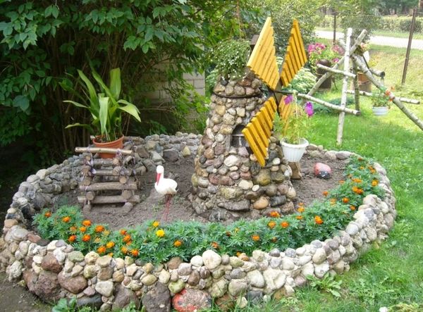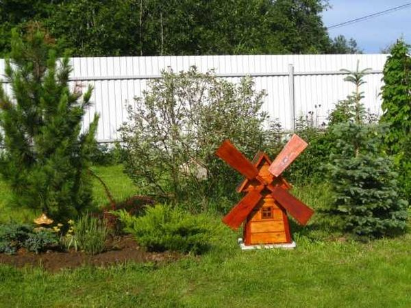 Simplement, le moulin, assemblé et installé au bon endroit dans le jardin, aura l'air ennuyeux et sans intérêt. La composition nécessite une décoration supplémentaire : équipez votre moulin de volets sculptés, placez une figurine de meunier à l'intérieur, ou vous pouvez réaliser un éclairage LED, puis au crépuscule les fenêtres du moulin brilleront mystérieusement.
