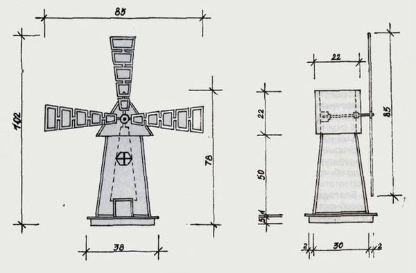 Vous pouvez faire un moulin pour un jardin de vos propres mains en bois ou en pierre, dans certains cas, il est complété par une cascade. Une éolienne standard se présente sous la forme d'un trapèze isocèle avec des pales fixées sur un côté de la structure. Pour plus de crédibilité, ils peuvent être alternés.