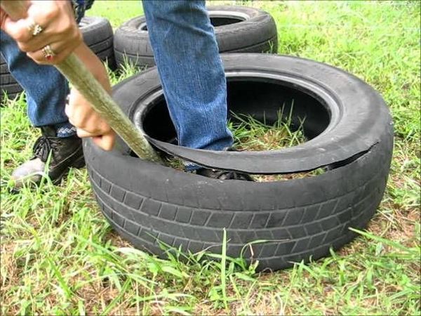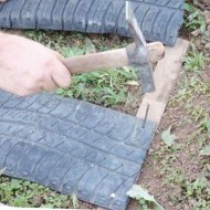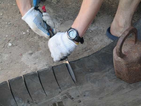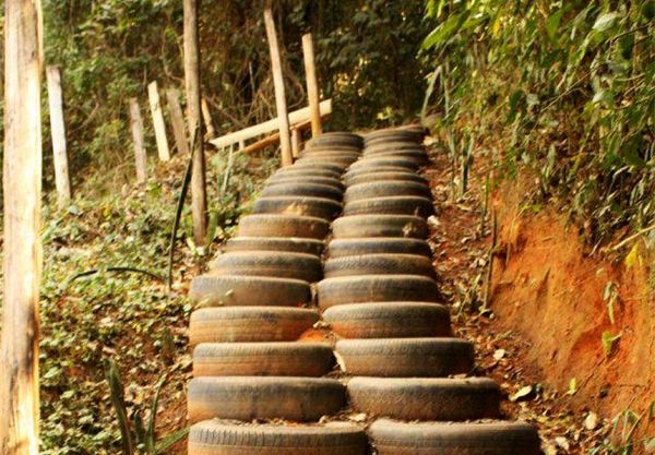 Avec une manipulation appropriée des matières premières avec des liquides huileux, les gros pneus peuvent être facilement coupés à la main. Un couteau bien aiguisé, un marteau, de la craie et des outils électriques pour couper des produits durs vous seront utiles. Le moyen le plus simple est de créer un chemin d'échelle de 40 à 50 pneus. Il est commode de la descendre jusqu'au réservoir, au belvédère et à l'aile d'été. Et si le bâtiment est situé sur une colline, c'est presque le seul moyen de se rendre à l'arrêt de bus.