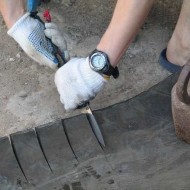 Tout d'abord, il est nécessaire de mesurer et de traiter correctement les produits. Pour que le caoutchouc se redresse plus rapidement, l'outil électrique est guidé le long du bord et ce n'est qu'alors que le pneu lui-même est coupé. Les bandes finies doivent être clouées sur des planches de pin et posées sur un sol nettoyé. La distance optimale entre les éléments du revêtement est de 1 mm. L'espace est nécessaire pour le drainage complet de la pluie et de l'eau de fonte.