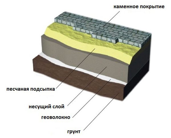 Le gravier (pierre concassée) est versé en premier, puis le sable vient. L'oreiller est versé avec de l'eau et soigneusement tassé. Il est recommandé d'utiliser une plaque vibrante pour augmenter la résistance.