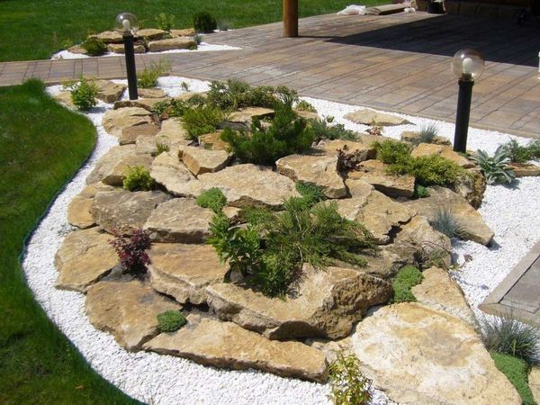 Pour créer de vos propres mains un élément exquis d'aménagement paysager, vous devez choisir un matériau en pierre de même format et de même structure. Il est permis d'utiliser à la fois des pavés et des dalles. Le grès, le schiste, le tuf et le calcaire absorbent bien l'eau, de sorte que la rocaille sera durable et toujours en fleurs.