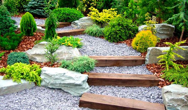 Les cailloux brillants et multicolores sont combinés avec succès avec de gros rochers de couleurs sombres, ainsi qu'avec du gravier de teintes saturées. Jouer sur le contraste de couleur et de taille créera une composition intéressante. Les galets servent également d'éclairage supplémentaire pour la rocaille après le coucher du soleil.