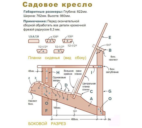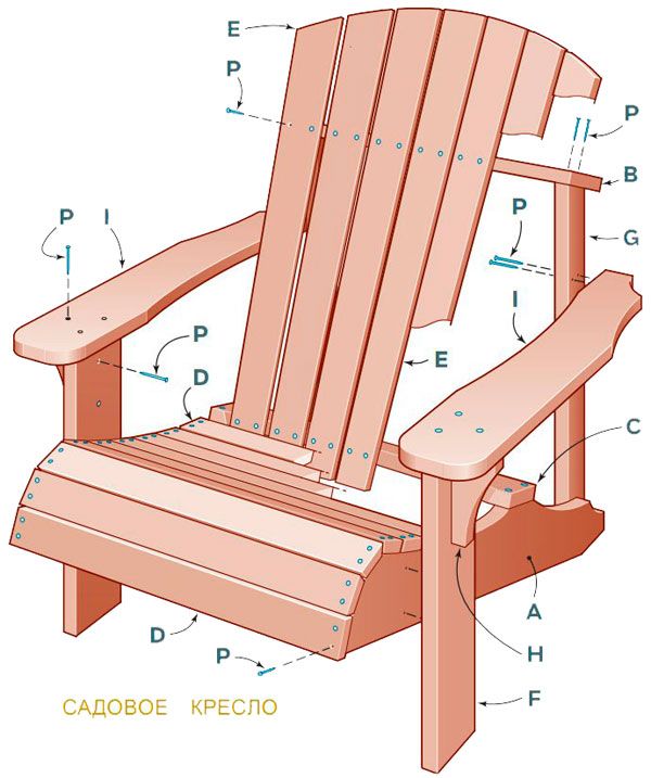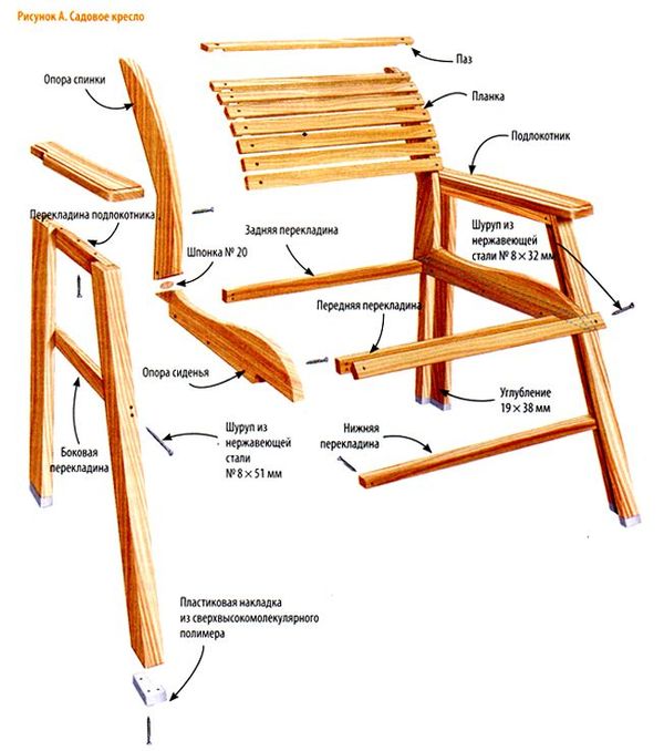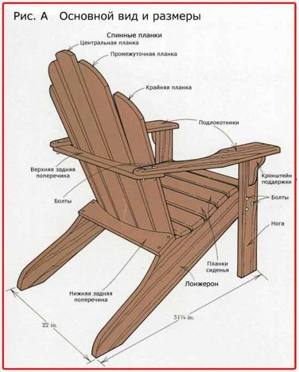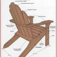 Si vous avez un dessin d'une chaise Adirondack à portée de main, vous obtiendrez un produit original avec des pieds incurvés de manière amusante. Il est important qu'ils soient légèrement plus hauts que le siège. Pour ce faire, les extrémités des matériaux doivent être raccourcies de 1,5 à 2 cm.Des instructions pas à pas pour tout modèle de chaise aideront à fixer sans erreur 8 à 10 lattes de siège, dos de produits, pieds avant et arrière. Il sera utile de faire des dessins des supports inférieurs et des accoudoirs.