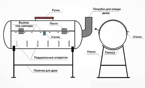 Élaborer un projet de barbecue à partir d'une bouteille de gaz ne prendra pas beaucoup de temps. Il suffit amplement de créer un dessin simple, dans lequel il est nécessaire d'indiquer les dimensions de la structure. Grâce au schéma développé, vous déterminerez la quantité de matériau requise, planifierez correctement l'emplacement des composants fonctionnels.