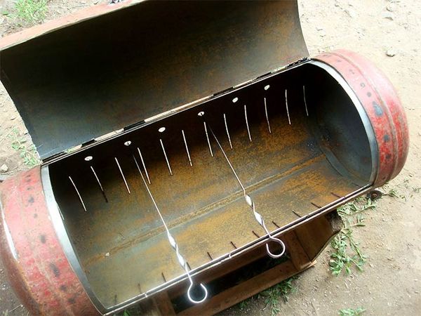 Les inconvénients d'un tel fabricant de barbecue sont au moins. Les utilisateurs soulignent les dimensions importantes de la capacité comme un inconvénient. Mais il existe également des options compactes en vente. Les professionnels notent que le fond semi-circulaire n'est pas très pratique lors de la mise à feu. Aussi, un brasero basé sur un cylindre est assez lourd, il est impossible de le transporter seul.