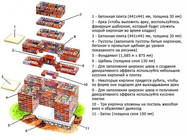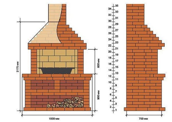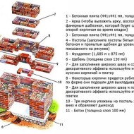 Si la matière première principale est la brique, il est impératif de faire un dessin en coupe du barbecue. Ensuite, posez les fondations, construisez une rangée de sous-sol, une cheminée et un auvent. Le travail prendra 5 à 7 jours, mais c'est le meilleur qui puisse être offert aux connaisseurs de produits de haute qualité.