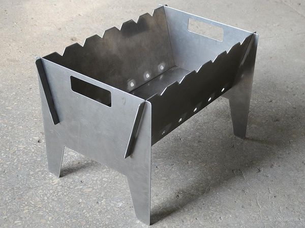 - Versions portables avec des épaisseurs de paroi de 1 à 3 mm. Les appareils les plus simples sont dépourvus de surfaces latérales et de fond, ce qui complique la préparation du barbecue. Il est préférable d'utiliser des unités plus puissantes avec une base en acier noir. Ils sont équipés de petites poignées pour un transport facile sur de longues distances.