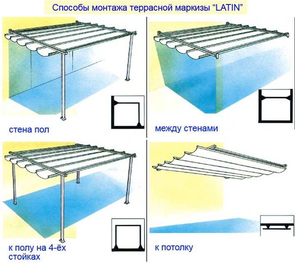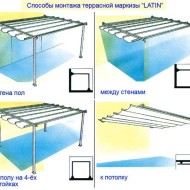 Les dimensions de l'auvent dépendent des dimensions de la véranda ou de la terrasse. Contrairement à une verrière conventionnelle, de telles structures sont fixées au mur du bâtiment principal d'un côté et peuvent être facilement pliées sans démonter la charpente. Les modèles à commande automatique sont très demandés par la population.