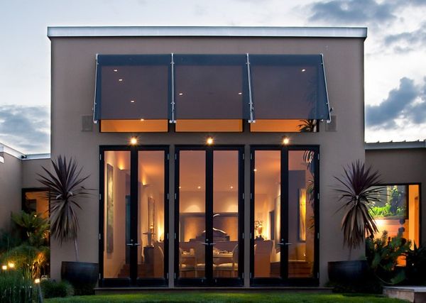 À l'entrée, les structures cintrées ont une meilleure apparence, ombrageant simultanément le toit et l'une des surfaces de la structure. Des auvents droits installés au-dessus des ouvertures des fenêtres protègent les rideaux de la décoloration. En conséquence, les chambres sont agréablement fraîches.