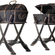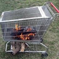 Un chariot de supermarché défectueux peut être réparé et utilisé comme barbecue ou grill à la campagne. Les parois inférieures et latérales du caddie sont scellées avec des tôles et l'étagère inférieure est utilisée pour stocker le bois de chauffage et le charbon.
