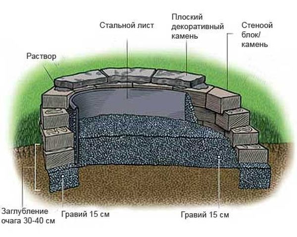 La conception de la source d'incendie à ciel ouvert doit être réalisée à l'aide de matériaux résistant au feu.L'utilisation d'une zone prête à l'emploi pour les réunions du soir nécessitera la fabrication d'un foyer dans le style inhérent à la zone sélectionnée. Cela peut être la finition extérieure de la source d'incendie avec le même matériau qui a été utilisé dans la construction du site.