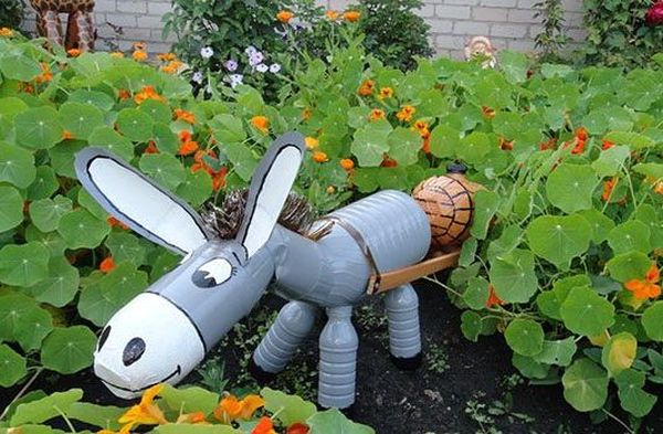Pour une figurine de lapin, il vous faut 2 bouteilles. Un récipient de cinq litres est pour le torse et un autre de deux litres pour les oreilles. Pour éviter que l'embarcation ne soit emportée par le vent, le conteneur doit être rempli de sable ou d'eau. Tout d'abord, les oreilles sont découpées sur la plus petite bouteille, laissant environ 5 cm de plastique pour une fixation ultérieure sur la tête. Les yeux, la bouche et les dents d'un lièvre sont dessinés sur une grosse aubergine. À la toute fin, les parties séchées sont connectées et la figurine finie est installée dans le jardin. De même, vous pouvez faire un cochon, un raton laveur et un chat.