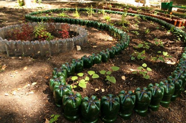 Les bouteilles placées horizontalement sont un enclos exquis pour tout jardin de fleurs. Plusieurs centaines de bidons de 2 litres, de mortier de ciment et de vieux pneus sont utiles aux travaux. Ces derniers servent de support à des structures de 1,5 mètre.