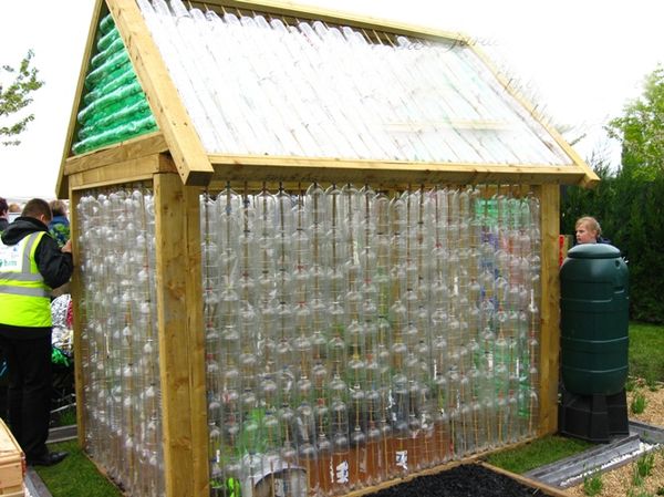 Vous ne pourrez pas construire complètement un bâtiment avec des bouteilles. Pour qu'il résiste aux vents violents, il devra former un cadre solide à partir de planches de bois ou de tuyaux métalliques. Et seulement après cela, vous pouvez commencer à installer les parois des récipients de 1,5 litre avec le cou vers le bas.