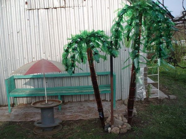 Pour un petit palmier de 1,5 mètre, il faut 40 bouteilles brunes et une vingtaine de vertes. Le cadre peut être en fil de fer et les branches en liège. Pour simuler des bananes, vous avez besoin de récipients jaunes d'une capacité de 0,5 litre.