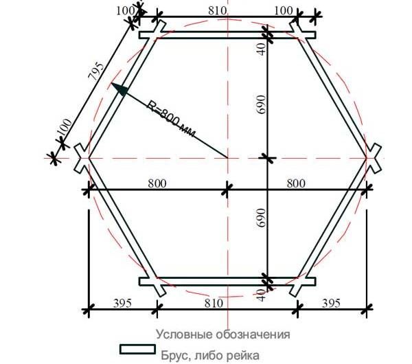 - Nous assemblerons un système de fermes de toit à six pentes à partir d'un bois préalablement préparé. Pour le pilier B, vous devez faire un hexagone en bois. C'est sur cette poutre que reposera tout le faîte du toit. Lors de l'assemblage des chevrons, l'angle entre les patins doit être contrôlé. Il doit faire 60°.