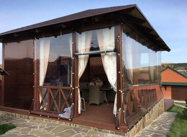 Dans les annexes totalement ouvertes, il est plus logique d'utiliser des rideaux de bâches réfractaires. Ils résistent mieux aux changements de température, retiennent la chaleur et ne laissent pas passer une goutte d'eau pendant au moins 3 saisons. Leur haute résistance à la combustion leur permet d'être utilisés dans les gazebos avec barbecues.