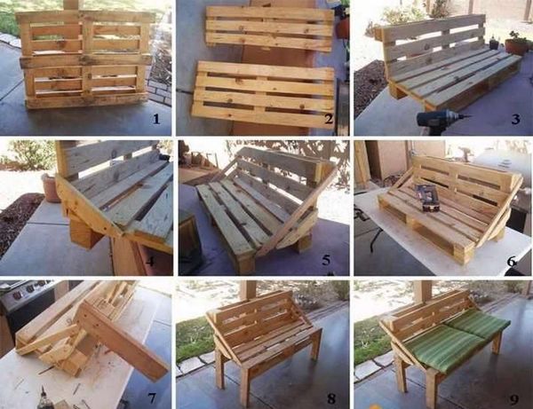 Le dossier, si nécessaire, est fixé de la même manière. Et à l'aide de petits blocs, en les plaçant sous le bord supérieur de la palette, vous pouvez ajuster l'inclinaison requise de ce même dossier. Pour réaliser un tel assemblage, il vous faudra :