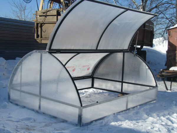 Si nous parlons du poids d'un tel design, il peut atteindre vingt-cinq à vingt-huit kilogrammes. Certes, vous devez utiliser des tuyaux profilés pour ce cadre et recouvrir le couvercle de polycarbonate. Dans ce cas, vous pouvez facilement déplacer le bâtiment vous-même si nécessaire.