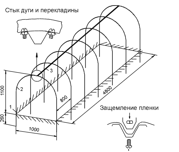 Une fois que tout le matériel est entre vos mains et prêt à l'emploi, vous pouvez commencer à travailler. Une telle serre doit être assemblée à l'aide de raccords à vis. Tout est mis en place assez simplement. Vous devez d'abord créer un cadre à partir d'arcs et d'une poutre longitudinale. Cette installation doit donc commencer par l'installation des arcs. Ils peuvent simplement être creusés dans le sol. Une fois tous les arcs installés, il est nécessaire de les connecter les uns aux autres au moyen d'une barre transversale.