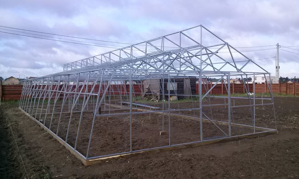 Tout d'abord, les serres selon Meathlider sont appréciées pour la forme inhabituelle du toit. Il est assez rare de trouver un toit à deux versants qui ne converge pas en un point, mais, au contraire, se situe sur deux niveaux. Ainsi, le degré différent d'inclinaison de chaque pente est également réglementé, car il y a deux poutres de support pour le toit. Le versant nord est le plus haut, le versant sud est jusqu'à 45 cm plus bas, ce qui permet de créer un système de ventilation aussi pratique.