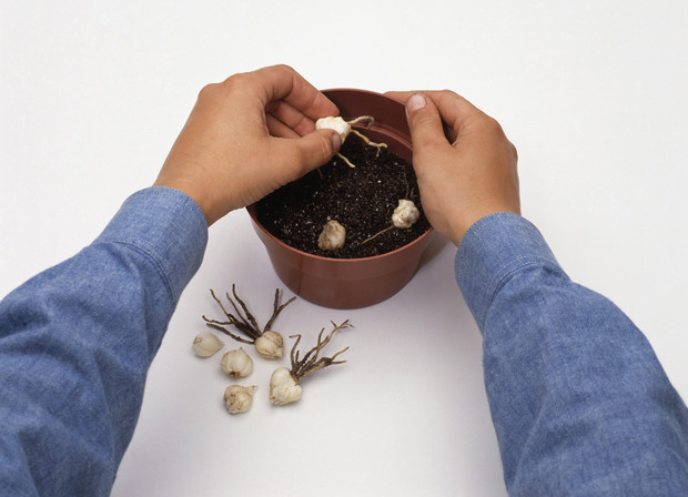 Il y a 1 oignon pour 1 pot de fleurs.Environ pour un pot d'une hauteur de 15 cm, un bulbe de 5 cm convient.Avant la plantation, une désinfection est effectuée, une solution de permanganate de potassium ou "Karbofos" est prise comme antiseptique. Si un long récipient est utilisé, les bulbes sont plantés à 5 cm d'intervalle. Enfoncez le matériel de plantation dans le sol aux 2/3.